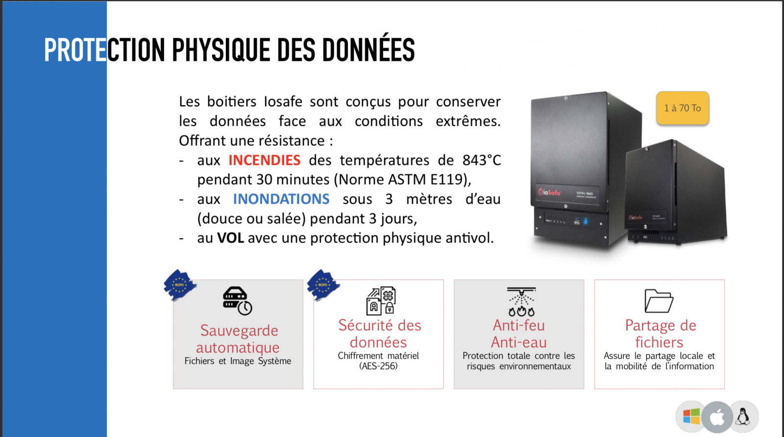 Grâce à un boitier IOSAFE contenant un ou plusieurs disques durs, les informations liées à votre entreprise seront protégées des dégâts informatiques et naturelles.